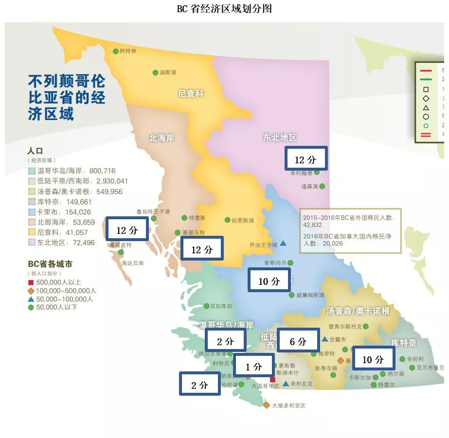 在这个BC省经济区域划分图中,我们标注了该区域的分数,也就是在打分系统中,社区的区域位置的所得分。区域分数较高可获得12分,可以获得满分的社区有Burns Lake,Terrace和Tumbler Ridge,均位于BC省的北部。而热门地区,包括Sunshine coast, Squamish, Comox等距离大温哥华地区较近的社区仅能获得1-2分的区域分数。由于自我申报部分的分数总分为140分,地域所带来的10分的分数差,是至关重要的。