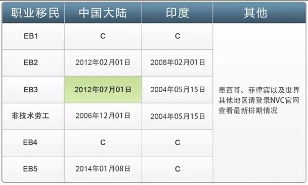 表为常规移民排期表(以上日期为签证最终颁发的日期),美国EB3中国大陆出生的第三优先申请,具体参见:http://travel. state.gov/content/visas/en/law-and-policy/bulletin/2016/visa-bulletin-for-january-2016.html