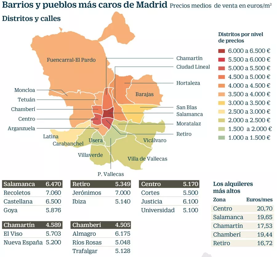 《五日报》报道,Engel & Völkers房地产公司关于马德里2018年至2019年房屋销售市场的报告显示,紧邻马德里丽池区(Retiro)和中区(Centro)的萨拉曼卡区(Salamanca)一直是该市最负有盛名的区分,该区分的平均房价可达6470欧元/平方米。